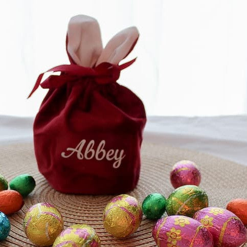 - Het formaat van de paas tasjes is 15x13,5 cm en ze zijn gemaakt van rayon fluweel in de kleuren roze, rood en grijsblauw.